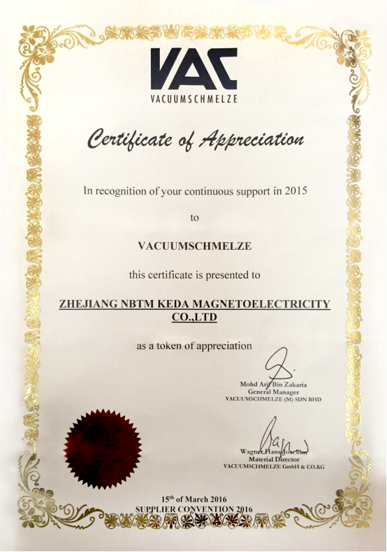 出席會議的除了VACUUMSCHMELZE(M) SDN BHD(馬來西亞)的總經(jīng)理,同時還有來自德國總公司及新加坡分公司的高層領(lǐng)導(dǎo)。VACUUMSCHMELZE(M) SDN BHD(馬來西亞)總經(jīng)理 Mohd Arif Bin Zakaria 發(fā)表致辭講話及頒獎。東睦科達(dá)獲得了由Mohd Arif Bin Zakaria 頒發(fā)的感謝函,感謝東睦科達(dá)長久以來對他們的支持。對東睦科達(dá)來說,這樣的獎勵無疑是很好的鼓勵。東睦科達(dá)將繼續(xù)為VACUUMSCHMELZE提供高質(zhì)量的產(chǎn)品以保持這種長期的友好的商業(yè)合作關(guān)系。